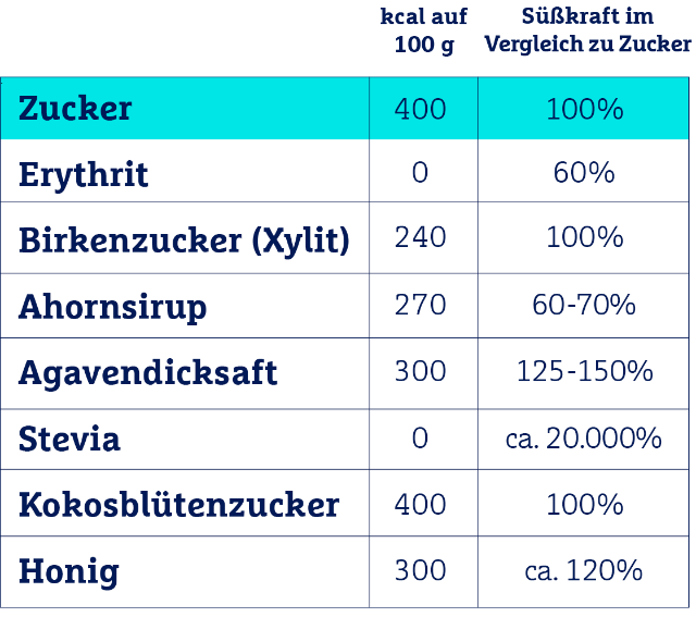 Die rechtsstehende Tabelle liefert Ihnen einen Vergleich der beschriebenen Zuckeralternativen inklusive der Kalorienmenge pro 100 Gramm sowie ihrer Süßkraft im Vergleich zu Zucker.