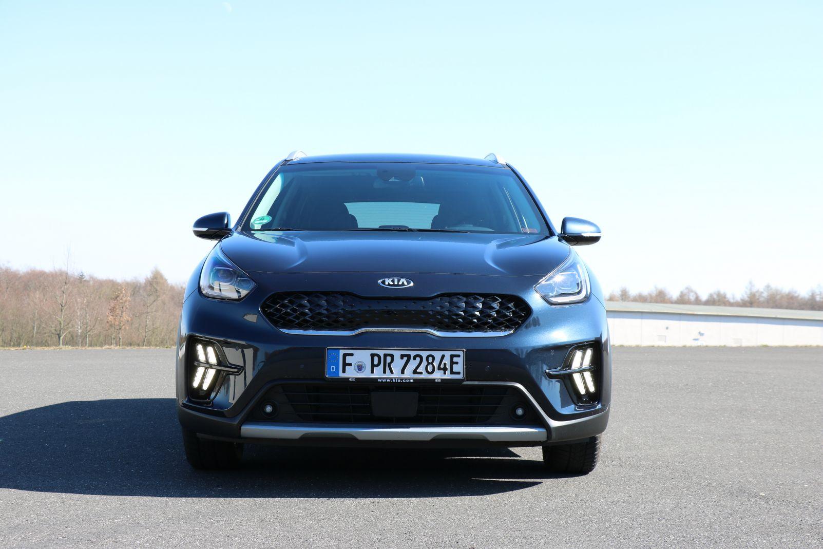 Grimmig blicken die Scheinwerfer drein und ziehen sich weit in die Kotflügel. Eine Etage darunter verbergen sich die Tagfahrleuchten, unten mittig die Radar-Sensorik. Angriffslustig und wie ein gespannter Muskel zeigt sich der Kia Niro. Das verdeutlicht beispielsweise die Motorhaube mit ihren prägnanten Sicken.