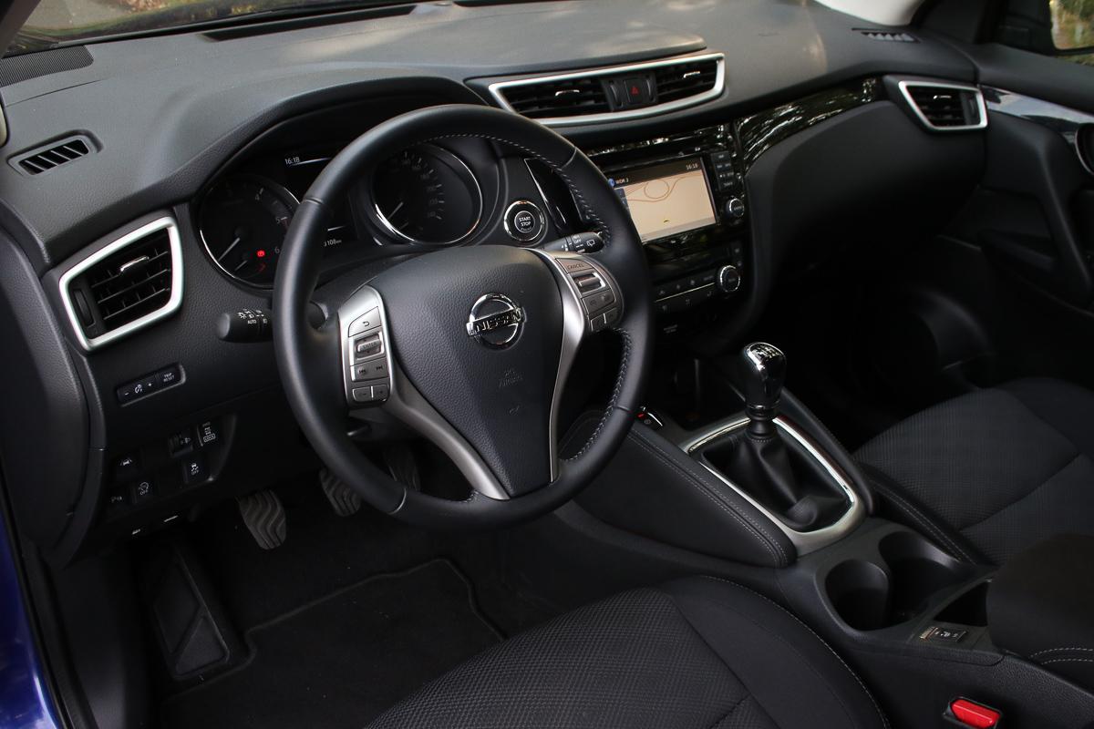 Ausreichend Platz bietet der Nissan Qashqai. Der Blick auf das Cockpit lässt viel Plastik erkennen, das allerdings im Vergleich zum eigenen Vorgänger nun optisch besser aussieht. Der Qashqai bietet viele praktische Ablagen. Die Kopf- und Beinfreiheit geht vorne und hinten vollkommen in Ordnung und der Qashqai empfiehlt sich auch als Familienfahrzeug. Zwei Kindersitze passen ohne Probleme auf die Rückbank, die Gurte sind ausreichend lang (selbst für Maxi-Cosi-Befestigungen). Leider fehlt dem Fahrzeug hinten der Einklemmschutz bei den elektrischen Fensterhebern.