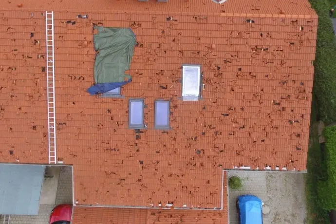 Weiter zum nächsten Schadenfall. Florian Schuch hat ihn eben erst hereinbekommen, es handelt sich um einen Neubau, einen Steinwurf vom Supermarkt entfernt. Die Dachziegel zersplittert, das Dachfenster zerbrochen, die Kaminkonstruktion zerstört und selbst die hölzerne Außenfassade ist beschädigt. Jeder Einschlag der gigantischen Hagelkörner ist zu sehen.