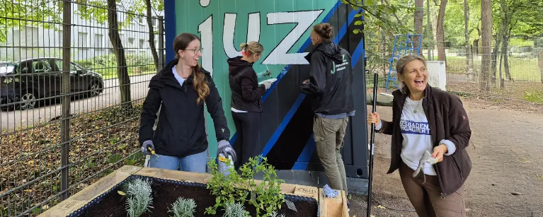 Das bestätigt auch Mit-Koordinatorin Jasmin. „Ich finde es total schön, aus der R+V heraus die Möglichkeit zu haben, der Gemeinschaft etwas zurückzugeben und gemeinsam mit Kollegen abseits des normalen Arbeitsalltags etwas Sinnvolles zu schaffen, etwas mit Purpose“, beschreibt sie ihre Motivation. „Ich bin immer ein bisschen auf der Suche, mein fachliches Know-how mit etwas Sozialem zu verbinden. Solche Projekte wie die Wiesbadener Aktionswoche ermöglichen das super.“ Die ursprünglich gelernte Stuckateurin hatte großen Spaß daran, „die Aufgaben zu strukturieren, den Überblick zu behalten und so ein bisschen das Team zu führen und zu motivieren.“ Und das ist ihr und Chris mit Blick auf das Erreichte absolut gelungen. Die beiden Container und das Hochbeet am Bolzplatz in Erbenheim sehen wieder einladend für die Jugendlichen aus.