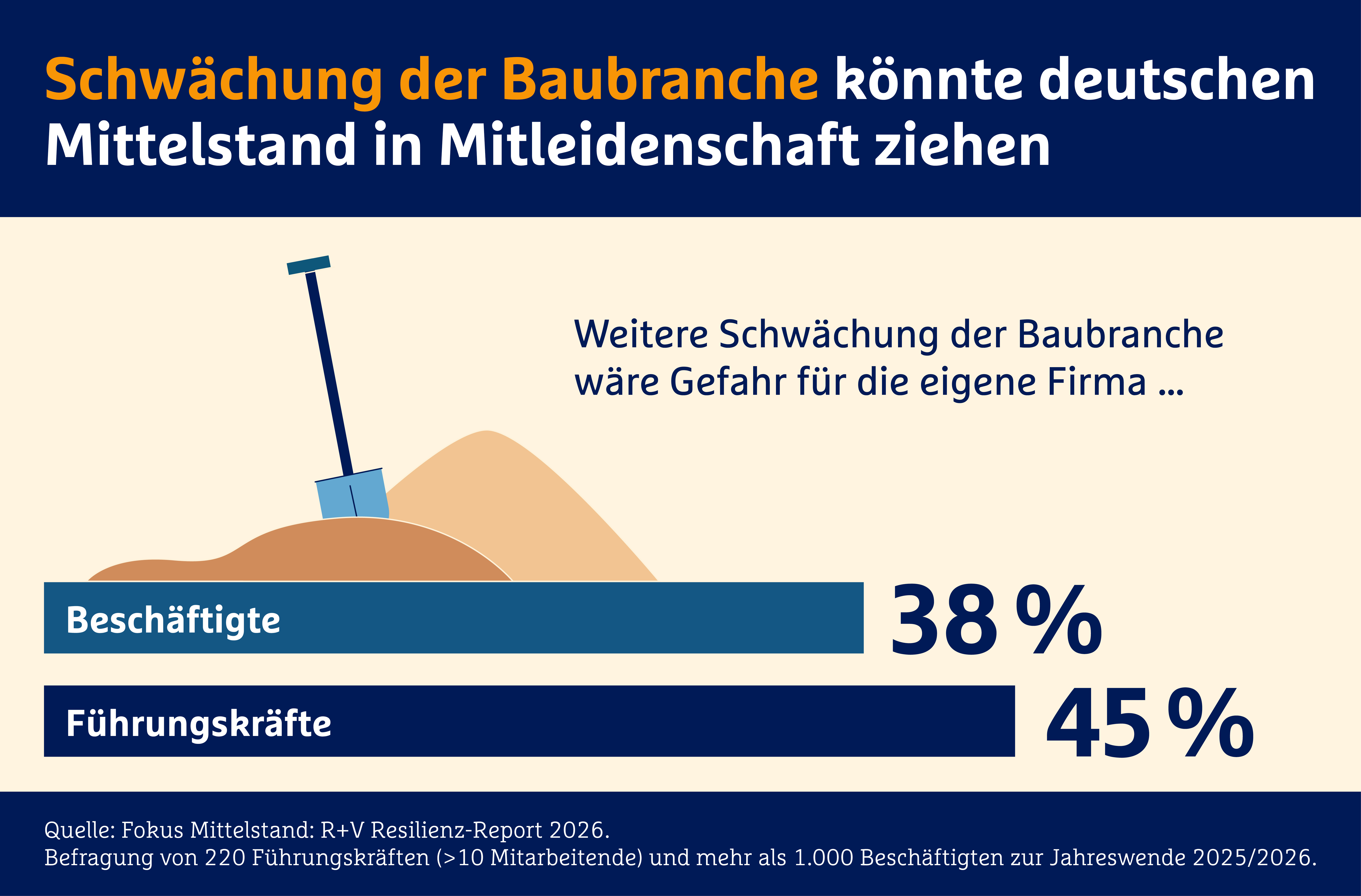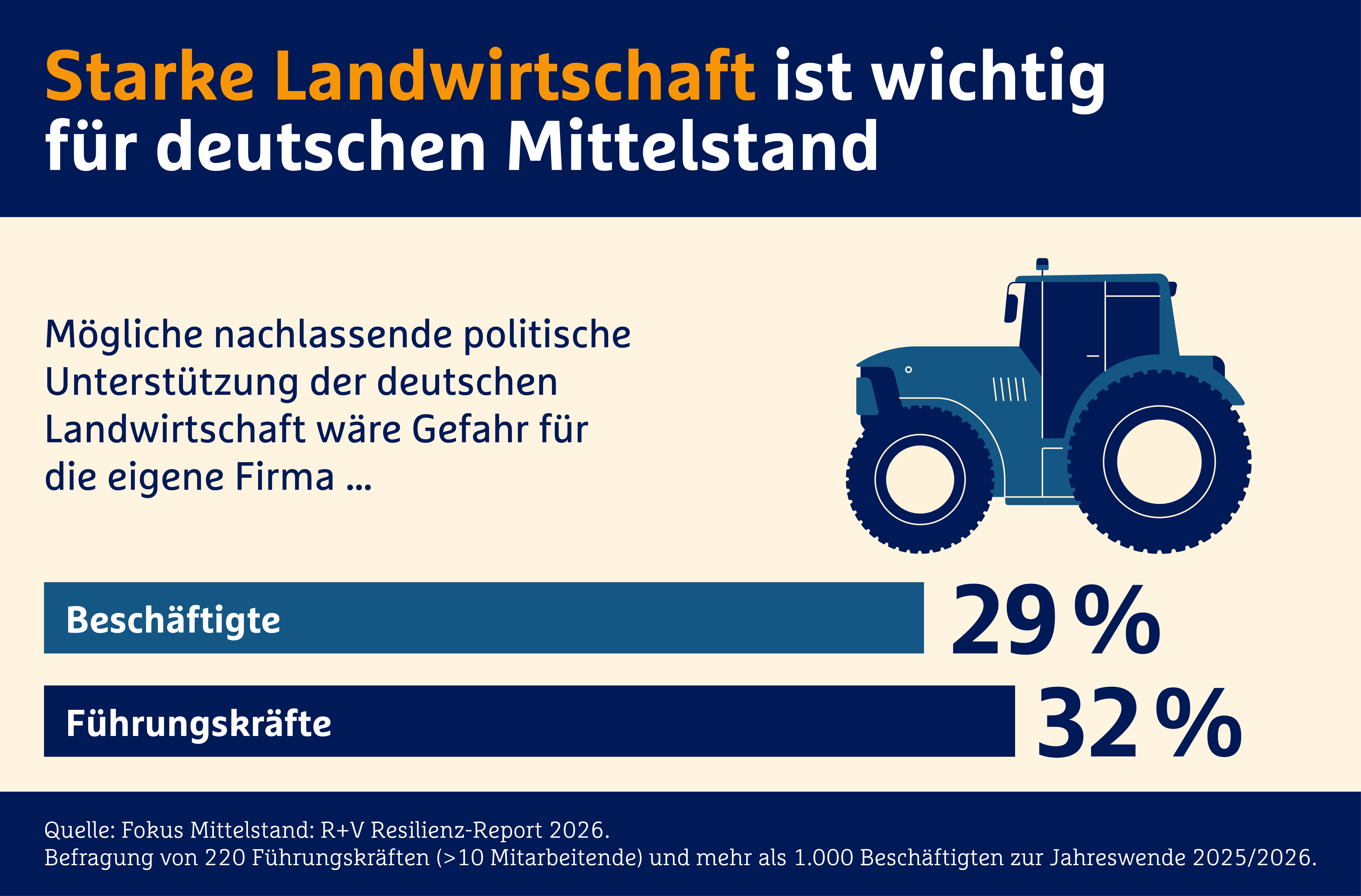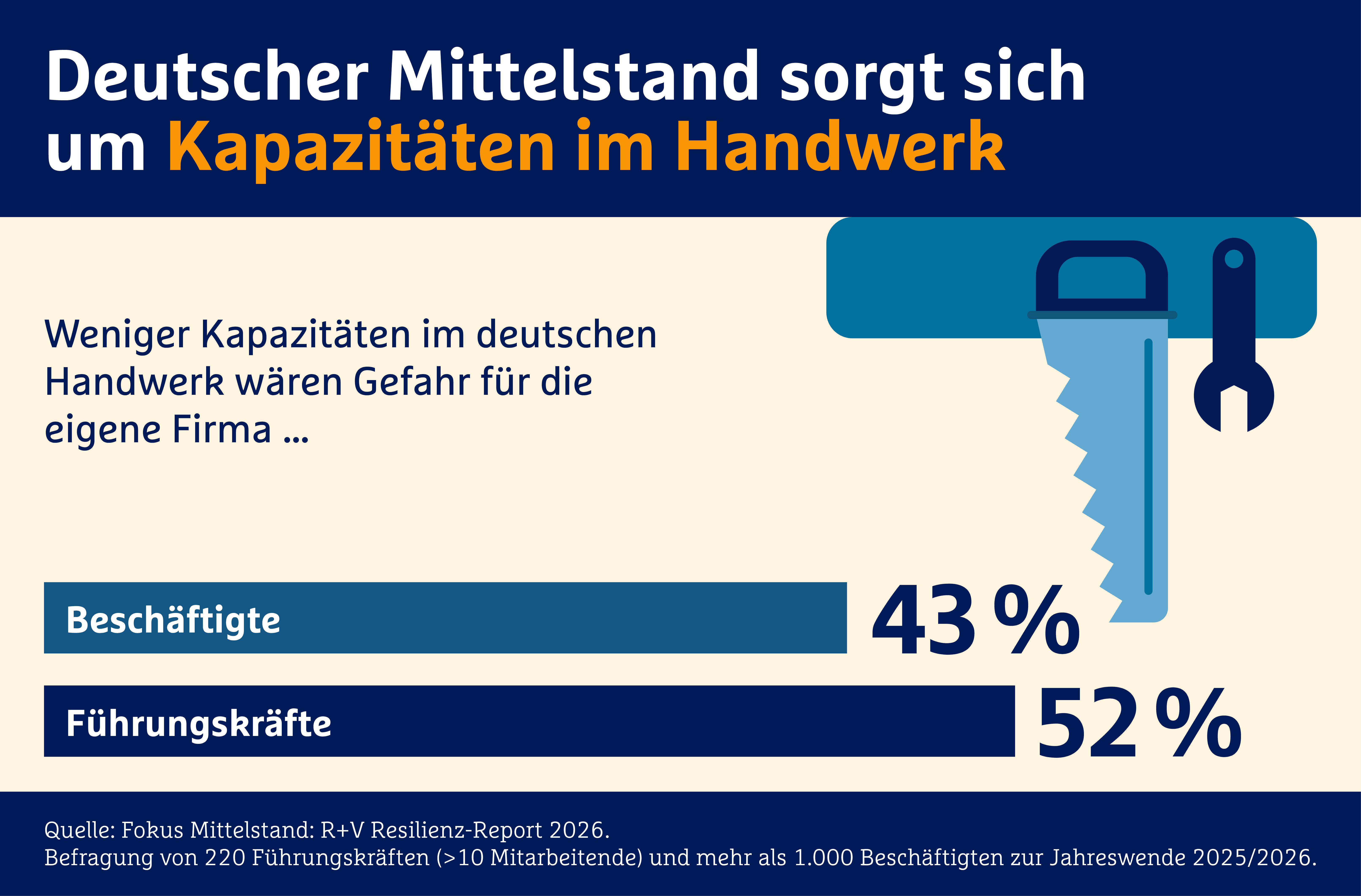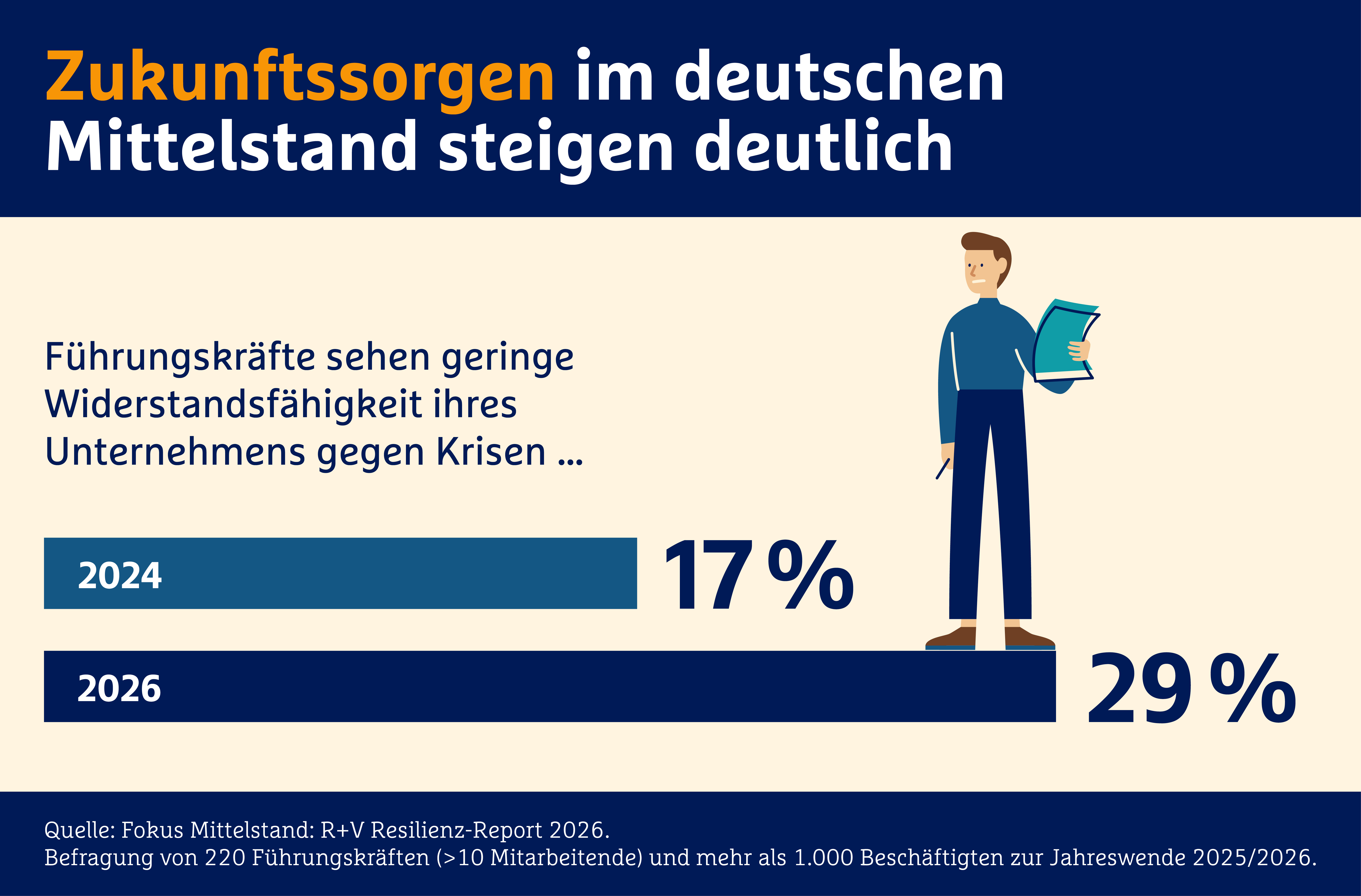 Wie gut ist der deutsche Mittelstand für die Zukunft gerüstet? Die Studie „Fokus Mittelstand: R+V Resilienz-Report 2026“ liefert zum zweiten Mal nach 2024 fundierte Antworten. Befragt wurden dafür zur Jahreswende 2025/26 parallel mehr als 220 Führungskräfte in Firmen mit mehr als 10 Mitarbeitenden und über 1.000 Beschäftigte. Dieses bifokale Studiendesign liefert ein aussagekräftiges Gesamtbild über die Themen und Herausforderungen im deutschen Mittelstand: beispielsweise zum Vertrauen in die Widerstandsfähigkeit des eigenen Unternehmens und zu den wichtigsten Handlungsfeldern und Maßnahmen, um die eigene Resilienz auszubauen.