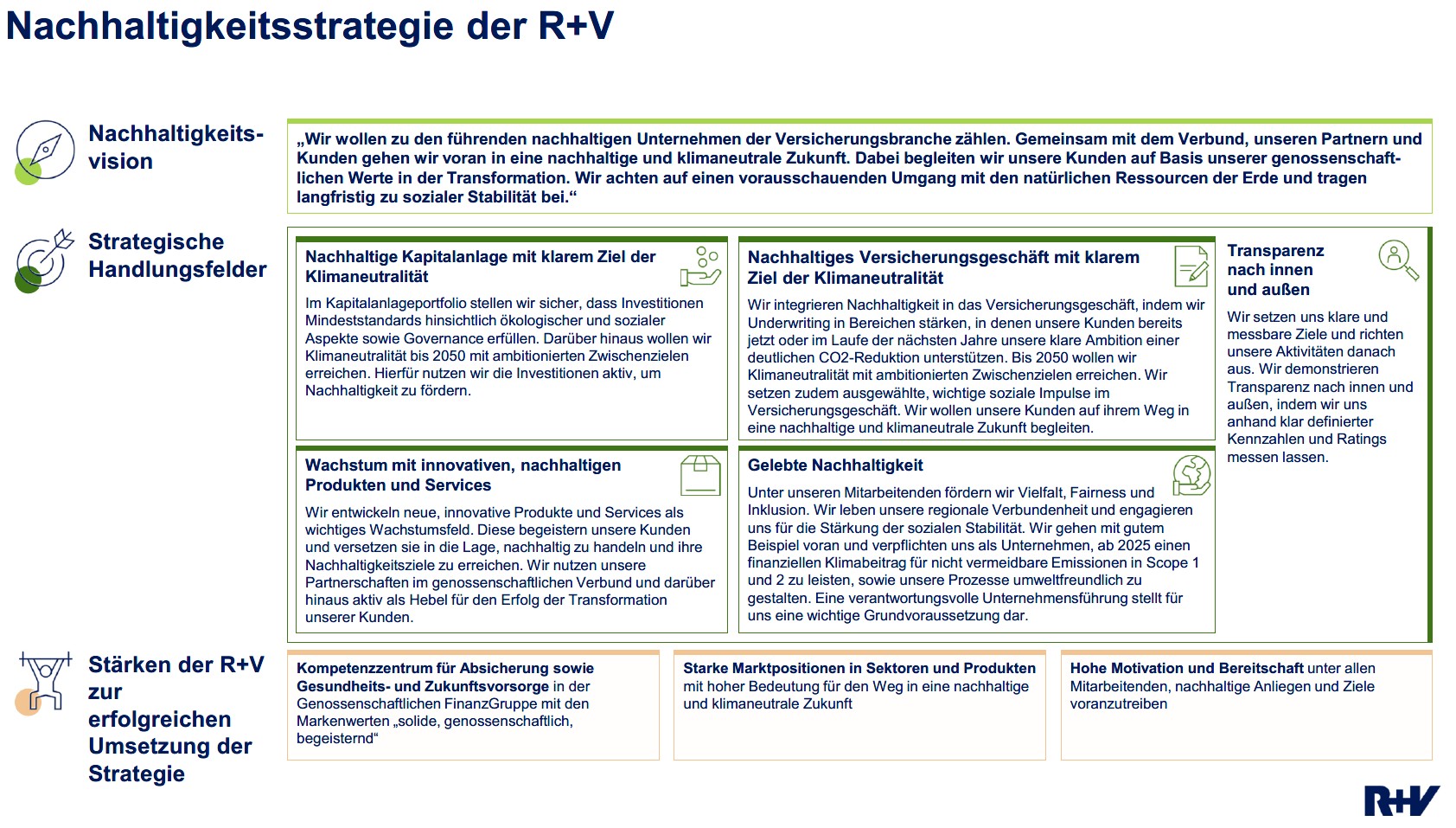 Aus der Nachhaltigkeitsvision und den Stärken der R+V wurden strategische Handlungsfelder abgeleitet, die in der Nachhaltigkeitsstrategie zusammengefasst werden.